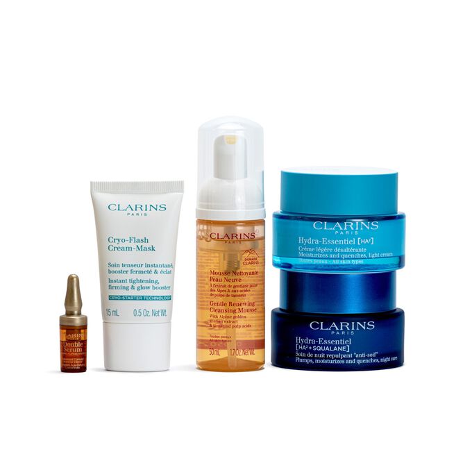 مجموعة تجميل من كلارنس تضم تشكيلة مختارة من منتجات العناية بالبشرة والجمال، لتنظيف البشرة، ترطيبها، تغذيتها، ومنحها لمسة من الإشراق في روتينك اليومي.
